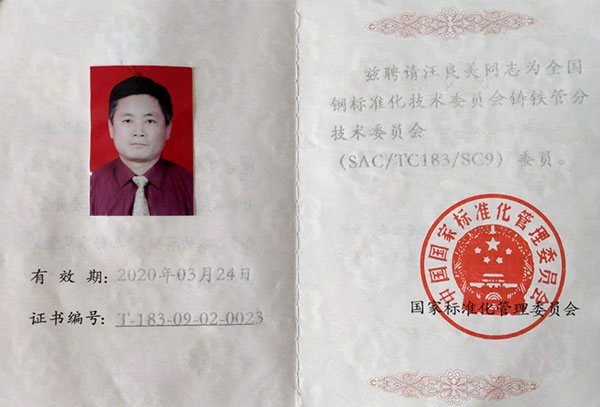 汪良美董事長被聘為全國鋼標委鑄鐵管分技術委員會委員